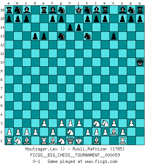 Last move : 0-1 2010 March 23 9:25:5 [Event "FICGS__BIG_CHESS__TOURNAMENT__000059"] [Site "FICGS"] [Date "2010.01.10"] [Round "1"] [White "Houtzager,Lex"] [Black "Rusli,Rafnizar"] [Result "0-1"] [WhiteElo ""] [BlackElo "1785"] 1.j2-k4 h15-g13 2.n2-n3 j15-k13 3.p1-o3 h16-o10 4.g2-g3 e15-e13 5.e2-e3 n15-n13 6.p2-p3 o10-o3 7.k4-m3 o3-q1 8.o1-n2 q1-q2 9.m1-o1 d15-d13 10.k1-l3 q2-q10 0-1 This big chess game has been lost on time (started : 2010.01.10 1:24:52) Follow this game move after move (download)A thorough understanding of the typical mating continuations makes the most complicated sacrificial combinations leading up to them not only not difficult, but almost a matter of course. (Siegbert Tarrasch) Zum Sieg gelangt man nicht, wenn man gut, sondern nur wenn man besser spielt (Savielly Grigorievitsch Tartakower) Un jugador que trata de regresar una movida en el Ajedrez es un futuro carterista. (Richard Fenton) Le thème de l'attaque double intervient d'une manière ou d'une autre dans l'immense majorité des combinaisons. (Youri Averbakh) Those parts of the system that you can hit with a hammer (not advised) are called hardware; those program instructions that you can only curse at are called software. (Anonymous)