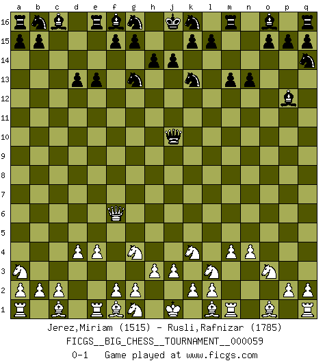 Last move : 0-1 2010 April 20 21:18:11 [Event "FICGS__BIG_CHESS__TOURNAMENT__000059"] [Site "FICGS"] [Date "2010.01.10"] [Round "1"] [White "Jerez,Miriam"] [Black "Rusli,Rafnizar"] [Result "0-1"] [WhiteElo "1515"] [BlackElo "1785"] 1.j2-k4 h15-g13 2.h1-o7 m15-m13 3.o7-c7 j15-k13 4.c7-c15 e15-e13 5.c15-c6 h16-o10 6.h2-g4 o10-o2 7.m2-m4 o2-o10 8.e2-e4 n15-n13 9.p1-o3 o10-j10 10.c6-j6 j10-b10 11.d2-d4 d15-d13 12.b1-a3 p16-q14 13.k1-l3 l16-p12 14.j6-f6 b10-q10 15.n2-n4 q10-j10 0-1 This big chess game has been lost on time (started : 2010.01.10 1:24:52) Follow this game move after move (download)Chess is mental torture. (Garry Kasparov) Ohne Leiden bildet sich kein Charakter. (Ernst Freiherr von Feuchtersleben) Aquel que toma al Peón de Caballo de la Reina, se pasará la noche a dormir en la calle. (Anónimo) Des points faibles ou des trous dans la position de l'adversaire doivent être occupés par des pièces et non pas par des pions. (Siegbert Tarrasch) Home computers are being called upon to perform many new functions, including the consumption of homework formerly eaten by the dog. (Doug Larson)