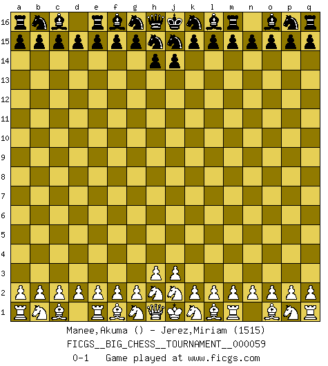 Last move : 0-1 2010 February 9 8:24:58 [Event "FICGS__BIG_CHESS__TOURNAMENT__000059"] [Site "FICGS"] [Date "2010.01.10"] [Round "1"] [White "Manee,Akuma"] [Black "Jerez,Miriam"] [Result "0-1"] [WhiteElo ""] [BlackElo "1515"] 0-1 This big chess game has been lost on time (started : 2010.01.10 1:24:52) Follow this game move after move (download)Up to this point White has been following well-known analysis. But now he makes a fatal error: he begins to use his own head. (Siegbert Tarrasch) Es gibt Leute, die glauben, alles wäre vernünftig, was man mit einem ernsthaften Gesicht tut. (Georg Christoph Lichtenberg) Coloca el contenido del tablero de Ajedrez en un sombrero, agita las piezas vigorosamente, derrámalas en el tablero desde una altura de medio metro y así obtienes el estilo de Wilhelm Steinitz. (H. E. Bird) On n'a jamais que l'âge auquel on a commence à jouer aux échecs car après on cesse de vieillir. (Capablanca) There is a great deal of difference between an eager man who wants to read a book and a tired man who wants a book to read. (G.K. Chesterton)