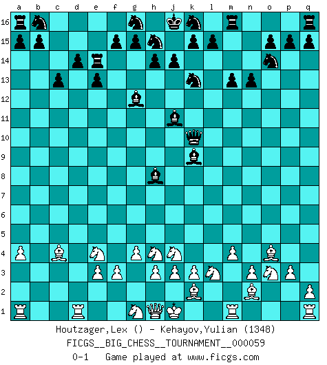 Last move : 0-1 2010 March 17 21:16:46 [Event "FICGS__BIG_CHESS__TOURNAMENT__000059"] [Site "FICGS"] [Date "2010.01.10"] [Round "1"] [White "Houtzager,Lex"] [Black "Kehayov,Yulian"] [Result "0-1"] [WhiteElo ""] [BlackElo "1348"] 1.d2-d4 j15-k13 2.c1-k8 d15-d14 3.g2-g4 h16-o10 4.j2-h4 o10-o2 5.p1-o3 o2-c13 6.n2-n3 c13-c2 7.b1-c3 c2-b2 8.e1-c1 b2-b11 9.k2-k3 m15-m13 10.c1-b1 b11-l11 11.l1-k2 l11-l2 12.o1-n2 l2-p6 13.p2-p3 p6-f6 14.f2-f3 f6-d4 15.c3-e4 d4-k10 16.k8-o4 e15-e13 17.h2-j4 n15-n13 18.b1-c1 c15-c13 19.a2-a4 c16-g12 20.m2-m3 o16-g9 21.e2-e3 f16-e15 22.k1-l3 e15-j11 23.f1-c4 p16-o14 24.m3-m4 l16-o13 25.c1-d1 e16-e14 26.d1-d4 g9-h8 27.d4-d1 o13-k9 0-1 This big chess game has been lost on time (started : 2010.01.10 1:24:52) Follow this game move after move (download)You have to have the fighting spirit. You have to force moves and take chances. (Bobby Fischer) Intelligenz läßt sich nicht am Weg, sondern nur am Ergebnis feststellen. (Garry Kasparov) Una victoria por una combinación errónea, aunque sea espectacular, me llena de horror artístico. (Wilhelm Steinitz) Même si l'adversaire joue le coup analysé précédemment, recommencez l'analyse en voyant la nouvelle position. Première règle de Blumenfeld Sometimes it pays to stay in bed in Monday, rather than spending the rest of the week debugging Monday's code. (Dan Salomon)