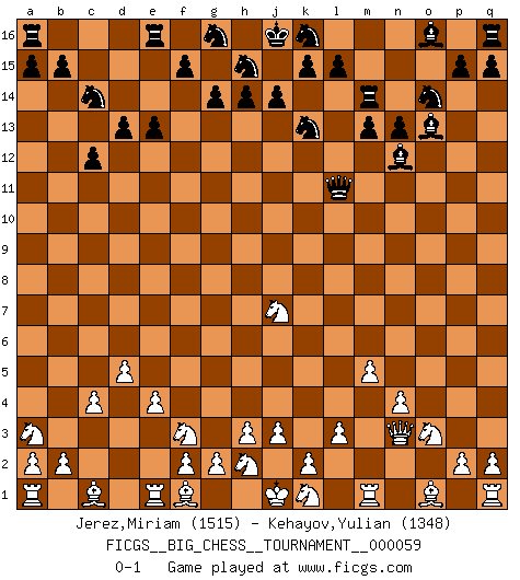 Last move : 0-1 2010 April 14 8:55:33 [Event "FICGS__BIG_CHESS__TOURNAMENT__000059"] [Site "FICGS"] [Date "2010.01.10"] [Round "1"] [White "Jerez,Miriam"] [Black "Kehayov,Yulian"] [Result "0-1"] [WhiteElo "1515"] [BlackElo "1348"] 1.j2-k4 j15-k13 2.h1-o7 g15-g14 3.o7-o15 m15-m13 4.o15-o4 c15-c13 5.e2-e4 d15-d13 6.m2-m4 h16-c11 7.g1-f3 n15-n13 8.l1-m2 e15-e13 9.k4-l6 c11-l11 10.m4-m5 b16-c14 11.n2-n4 c13-c12 12.d2-d4 f16-c13 13.p1-o3 c13-o2 14.l2-l3 o2-d12 15.m2-n3 d12-n3 16.o4-n3 p16-o14 17.d4-d5 l16-o13 18.b1-a3 c16-k9 19.c2-c4 m16-m14 20.l6-j7 k9-n12 0-1 This big chess game has been lost on time (started : 2010.01.10 1:24:52) Follow this game move after move (download)Spassky will not be psyched out by Fischer. (Mike Goodall) Ich liebe den Moment, wenn ich das Ego meines Gegenüber breche. (Robert James Fischer) Los asuntos humanos son como una partida de Ajedrez: solo aquellos que no lo toman seriamente, pueden ser llamados buenos jugadores. (Hung Tzu Ch'eng) A chaque perte on perd un peu de soi. (Joël Lautier) I have opinions of my own - strong opinions - but I don't always agree with them. (George Bush)