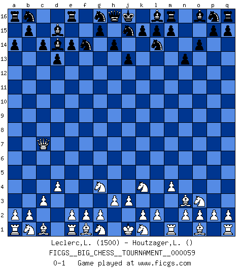 Last move : 0-1 2010 February 16 13:38:2 [Event "FICGS__BIG_CHESS__TOURNAMENT__000059"] [Site "FICGS"] [Date "2010.01.10"] [Round "1"] [White "Leclerc,Luc-Olivier"] [Black "Houtzager,Lex"] [Result "0-1"] [WhiteElo "1500"] [BlackElo ""] 1.j2-k4 k16-l14 2.h1-o7 o15-o14 3.o7-f15 h15-f14 4.f15-c12 c15-c14 5.c12-c7 j14-j13 6.h2-g4 e15-e14 7.m2-m4 n15-n13 8.l1-n3 d15-d13 9.c2-c3 c16-d15 10.p1-o3 a15-a14 11.d2-d4 f16-d14 0-1 Follow this game move after move (download)If I win a tournament, I win it by myself. I do the playing. Nobody helps me. (Bobby Fischer) Wenn ich einen Club besuche, sind die Spieler stumm vor Staunen. (José Raúl Capablanca) Vive, pierde y aprende al observar a tu oponente como ganar. (Amber Steenbock) On a dit que l'homme se distingue de l'animal par le fait qu'il achète plus de livres qu'il ne peut en lire. Je voudrais suggérer qu'inclure à la liste des livres quelques livres d'échecs rendrait la distinction manifeste. (Edward Lasker) I would love to change the world, but they won't give me the source code. (Unknown)