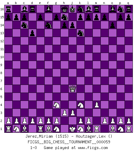 Last move : 1-0 2010 March 27 9:33:44 [Event "FICGS__BIG_CHESS__TOURNAMENT__000059"] [Site "FICGS"] [Date "2010.01.10"] [Round "1"] [White "Jerez,Miriam"] [Black "Houtzager,Lex"] [Result "1-0"] [WhiteElo "1515"] [BlackElo ""] 1.j2-k4 j15-k13 2.h1-o7 o15-o14 3.o7-f15 e16-d16 4.f15-c12 b16-c14 5.m2-m4 g16-f14 6.h2-g4 d15-d13 7.c12-j6 1-0 This big chess game has been lost on time (started : 2010.01.10 1:24:52) Follow this game move after move (download)Play the opening like a book, the middle game like a magician, and the endgame like a machine. (Spielmann) Alle Schachspieler sollten auch ein Hobby haben. (Savielly Grigorievitsch Tartakower) El Ajedrez es un cuento de Hadas de las 1001 metidas de pata. (Savielly Tartakower) Si je n'étais pas joueur d'échecs, je serais le meilleur dans quelque chose d'autre. (Anatoli Karpov) I think your argument is specious - I think your tie is ugly. (Gregory House to Dr. Foreman, House M.D.)