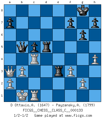 Last move : 1/2-1/2 2010 June 11 5:0:38 [Event "FICGS__CHESS__CLASS_C__000133"] [Site "FICGS"] [Date "2010.01.10"] [Round "1"] [White "D Ottavio,Aldo"] [Black "Payzansky,Aleksey"] [Result "1/2-1/2"] [WhiteElo "1647"] [BlackElo "1799"] 1.e4 c5 2.Nf3 d6 3.d4 cxd4 4.Nxd4 Nf6 5.Nc3 g6 6.Be3 Bg7 7.f3 O-O 8.Qd2 Nc6 9.O-O-O d5 10.exd5 Nxd5 11.Nxc6 bxc6 12.Bd4 Nxc3 13.Qxc3 Bh6+ 14.Be3 Bxe3+ 15.Qxe3 Qb6 16.Qxe7 Be6 17.Bd3 Qe3+ 18.Rd2 Rfe8 19.Qf6 Rad8 20.h4 Bf5 21.Qg5 Qe6 22.Kb1 Bxd3 23.cxd3 Rd5 24.Qf4 c5 25.Rc1 Qd7 26.Rdc2 Kg7 27.b3 Rd4 28.Qg5 Rd5 29.Qg4 Qb5 30.Qc4 Qd7 31.Qc3+ Kg8 32.Qf6 Qb5 33.Rc4 Re3 34.Qb2 Rexd3 35.Qa3 Re3 1/2-1/2 Sicilian : Dragon, Yugoslav attack, 7...O-O Kingside Castling by player Black (move 7) Queenside Castling by player White (move 9) This chess game ended in a draw. Follow this game move after move (download)Fischer prefers to enter Chess history alone. (Miguel Najdorf) Lisa Lane, amerikanische Schachmeisterin, hatte Fischer einmal als stärksten lebenden Spieler bezeichnet. Antwort: Das ist richtig, aber Lisa Lane ist eigentlich nicht in der Lage, das zu beurteilen. (Robert James Fischer) El Rey es una pieza de pelea. ¡Usenlo!. (Wilhelm Steinitz) On est toujours la mazette de quelqu'un d'autre. (Anonyme) Wipe them out. All of them. (Darth Sidious in Star Wars ep.1)