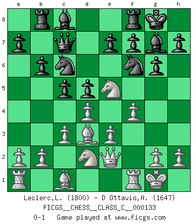 Last move : 0-1 2010 February 16 13:38:21 [Event "FICGS__CHESS__CLASS_C__000133"] [Site "FICGS"] [Date "2010.01.10"] [Round "1"] [White "Leclerc,Luc-Olivier"] [Black "D Ottavio,Aldo"] [Result "0-1"] [WhiteElo "1800"] [BlackElo "1647"] 1.f4 d5 2.Nf3 Nf6 3.e3 g6 4.d4 Bg7 5.Bd3 O-O 6.O-O c5 7.c3 b6 8.Qe2 Nc6 9.Nbd2 Qc7 10.Ne5 Rb8 0-1 Bird's Opening Kingside Castling by player Black (move 5) Kingside Castling by player White (move 6) Player Black won this chess game. Follow this game move after move (download)Not only will I predict his triumph over Botvinnik, but I'll go further and say that he'll probably be the greatest Chess player that ever lived. (John Collins) Das typische an einem Großmeister ist, daß er eine gewonnene Position schnell und schmerzlos gewinnt. (Irving Chernev) Aquellos que dicen que entienden al Ajedrez, no entienden nada. (Robert Hubner) Le moment que je préfère le plus dans une rencontre, c'est celui où je sens que la personnalité de l'adversaire se brise. (Robert Fischer) I live to kill Traxler counterattack. (Ilmars Cirulis)