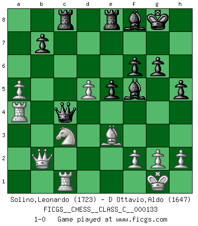 Last move : 1-0 2010 July 10 21:19:46 [Event "FICGS__CHESS__CLASS_C__000133"] [Site "FICGS"] [Date "2010.01.10"] [Round "1"] [White "Solino,Leonardo"] [Black "D Ottavio,Aldo"] [Result "1-0"] [WhiteElo "1723"] [BlackElo "1647"] 1.e4 c5 2.c3 g6 3.d4 cxd4 4.cxd4 d5 5.exd5 Nf6 6.Nc3 Nxd5 7.Bc4 Nb6 8.Bb3 Bg7 9.Nf3 O-O 10.O-O Nc6 11.d5 Na5 12.Re1 Nxb3 13.axb3 Re8 14.Ne5 h5 15.Bf4 Bf5 16.Qf3 Nd7 17.Qe2 Qb6 18.Nxd7 Bxd7 19.Be5 f6 20.Bf4 Qxb3 21.Qd2 Bf5 22.Ra3 Qc4 23.Ra4 Qd3 24.Qc1 e5 25.Be3 a5 26.Rd1 Qa6 27.b4 Rac8 28.Qb2 Qc4 29.Rc1 Bf8 30.bxa5 1-0 This chess game has been lost on time (started : 2010.01.10 11:7:21) Sicilian : Alapin's variation (2.c3) Kingside Castling by player Black (move 9) Kingside Castling by player White (move 10) Player White won this chess game. Follow this game move after move (download)Some part of a mistake is always correct. (Savielly Tartakover) Schach sollte überall auf der Welt Schulfach werden. Es fördert die geistige Auseinandersetzung. Es lehrt die Demut in der Niederlage. (Garry Kasparov) Los Peones son el alma de una partida de Ajedrez. (Francois Andre Danican Philidor) Les Echecs sont affaire de jugement sensible. Savoir quand frapper et quand esquiver. (Fischer) History is the quarrels of popes and kings, with wars or pestilences in every page; the men all so good for nothing, and hardly any women at all. (Jane Austen)