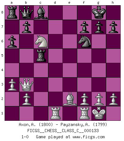 Last move : 1-0 2010 January 12 18:57:4 [Event "FICGS__CHESS__CLASS_C__000133"] [Site "FICGS"] [Date "2010.01.10"] [Round "1"] [White "Axon,Alexander"] [Black "Payzansky,Aleksey"] [Result "1-0"] [WhiteElo "1800"] [BlackElo "1799"] 1.e4 c5 2.c3 d5 3.exd5 Qxd5 4.d4 cxd4 5.cxd4 e5 6.dxe5 Qxe5+ 7.Be2 Nc6 8.Nf3 Qa5+ 9.Bd2 Bb4 10.Nc3 Nf6 11.O-O O-O 12.a3 Be7 13.Qb3 Qc7 14.Nb5 Qb8 15.Rad1 a6 16.Nbd4 Nxd4 17.Nxd4 Rd8 18.Ba5 Rd5 19.Bb6 Bc5 20.Bxc5 Rxc5 21.Nc6 1-0 Sicilian : Alapin's variation (2.c3) Kingside Castling by player White (move 11) Kingside Castling by player Black (move 11) Player White won this chess game. Follow this game move after move (download)Your body has to be in top condition. Your Chess deteriorates as your body does. You can't separate body from mind. (Bobby Fischer) Der Bart als Geschlechtszeichen mitten im Gesicht ist obszön. Daher gefällt er den Weibern. [Zugegeben, kein Schachzitat, aber unglaublich originell] (Arthur Schopenhauer) Nos gusta pensar. (Gary Kasparov) Les Cavaliers se révèlent fort utiles dans les positions fermées. D'habitude, les Fous sont un peu plus forts que les Cavaliers dans les positions ouvertes. Qu'on le veuille ou non, il restera toujours des exceptions ! Real knowledge is to know the extent of one's ignorance. (Confucius)