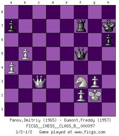 Last move : 1/2-1/2 2010 July 20 12:30:49 [Event "FICGS__CHESS__CLASS_B__000097"] [Site "FICGS"] [Date "2010.01.12"] [Round "1"] [White "Panov,Dmitriy"] [Black "Dumont,Freddy"] [Result "1/2-1/2"] [WhiteElo "1965"] [BlackElo "1957"] 1.e4 c5 2.c3 Nf6 3.e5 Nd5 4.d4 cxd4 5.cxd4 e6 6.Nf3 d6 7.Bc4 Nb6 8.Bd3 Nc6 9.O-O Nb4 10.Bg5 Be7 11.Bxe7 Qxe7 12.Nc3 O-O 13.Be4 d5 14.Bb1 Bd7 15.a3 Nc6 16.Qd3 f5 17.exf6 gxf6 18.Re1 Kh8 19.Ba2 Qg7 20.Rac1 Rad8 21.Re3 e5 22.Nxd5 Rg8 23.g3 Be6 24.Nxb6 Bxa2 25.Nc4 exd4 26.Re4 Qg6 27.Rce1 b5 28.Ncd2 Bd5 29.Qxb5 Bxe4 30.Rxe4 f5 31.Rf4 Rgf8 32.Qd3 Rd5 33.b4 Qf6 34.Ne4 Qg7 35.Neg5 Ne5 36.Nxe5 Qxe5 37.Rh4 Rd7 38.Nf3 Qe6 39.Rxd4 Rfd8 40.Rxd7 Rxd7 41.Qc3+ Kg8 42.Qc8+ Kg7 43.Kg2 f4 44.Qc3+ Kg8 45.Qc8+ Kg7 46.b5 h6 47.a4 Qf5 48.Qc6 fxg3 49.hxg3 Rf7 50.Qc3+ Kh7 51.Qb3 Kg8 52.Qc3 Kh7 53.Qb3 Kg8 54.Qc3 Kh7 1/2-1/2 Sicilian : Alapin's variation (2.c3) Kingside Castling by player White (move 9) Kingside Castling by player Black (move 12) This chess game ended in a draw. Follow this game move after move (download)I feel as if I were a piece in a game of Chess, when my opponent says of it: That piece cannot be moved. (Soren Kierkegaard) Ich tröste mich mit dem Vergnügen, daß Schachfans, Zuschauer und Leser glücklich sind, wenn ein Großmeister etwas riskiert, statt nur Klötzchen zu schieben. (Mikhail Nekhemyevich Tal) En partidas rápidas, el Caballo es mas poderoso que el Alfil. (Vlastimil Hort) Pour moi, les échecs ne sont pas un jeu mais un art. (Alexandre Alekhine) Wisdom is the reward you get for a lifetime of listening when you'd have preferred to talk. (Doug Larson)