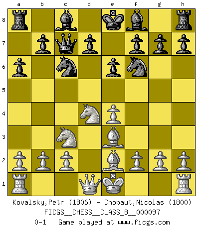 Last move : 0-1 2010 March 10 21:51:34 [Event "FICGS__CHESS__CLASS_B__000097"] [Site "FICGS"] [Date "2010.01.12"] [Round "1"] [White "Kovalsky,Petr"] [Black "Chobaut,Nicolas"] [Result "0-1"] [WhiteElo "1806"] [BlackElo "1800"] 1.e4 c5 2.Nf3 e6 3.d4 cxd4 4.Nxd4 Nc6 5.Nc3 a6 6.Be3 Nf6 7.Be2 Qc7 0-1 This chess game has been lost on time (started : 2010.01.12 4:22:44) Sicilian : Taimanov variation Player Black won this chess game. Follow this game move after move (download)When you don't know what to do, wait for your opponent to get an idea - it's sure to be wrong. (Tarrasch) Rauchen ist dem Schachspieler bei seiner Arbeit, also im Wettkampf, untersagt. (Viktor Kortschnoi) Fischer es una tragedia del Ajedrez Americano a la par con Morphy y Pillsbury. (Mig Greengard) Même si l'adversaire joue le coup analysé précédemment, recommencez l'analyse en voyant la nouvelle position. Première règle de Blumenfeld Perfection is achieved, not when there is nothing more to add, but when there is nothing left to take away. (Antoine de Saint-Exupéry)