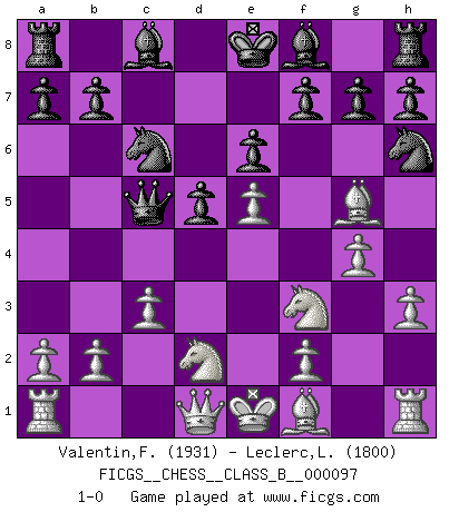 Last move : 1-0 2010 February 16 13:38:53 [Event "FICGS__CHESS__CLASS_B__000097"] [Site "FICGS"] [Date "2010.01.12"] [Round "1"] [White "Valentin,Florea"] [Black "Leclerc,Luc-Olivier"] [Result "1-0"] [WhiteElo "1931"] [BlackElo "1800"] 1.e4 c6 2.d4 d5 3.e5 c5 4.dxc5 e6 5.Be3 Nh6 6.Nf3 Nf5 7.Bg5 Qa5+ 8.c3 Qxc5 9.g4 Nh6 10.h3 Nc6 11.Nbd2 1-0 Caro-Kann : Advance variation Player White won this chess game. Follow this game move after move (download)Chess is played with the mind and not with the hands ! (Renaud and Kahn) Das Blackmar-Diemer-Gambit verändert den ganzen Menschen! (Emil Joseph Diemer) El jugador blanco perdió porque fallo en recordar la coreccta continuación y tuvo que pensar por sí mismo las movidas. (Siegbert Tarrasch) Le plus grand jeu de l'esprit jamais inventé, plus vous l'apprenez, plus vous y prenez du plaisir. (Garry Kasparov) Thibault, I ask for draw. Game 13876. - Sorry Ilmars, you won. (FICGS chat)