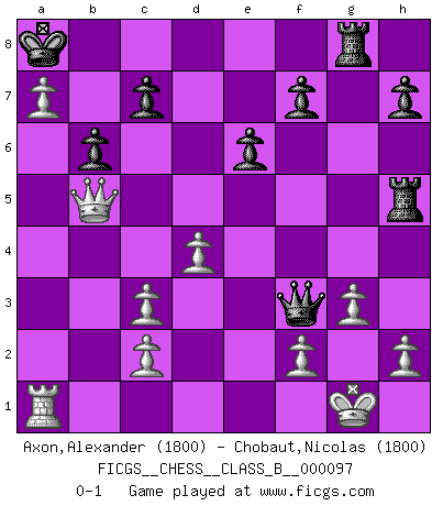 Last move : 0-1 2010 July 20 9:33:36 [Event "FICGS__CHESS__CLASS_B__000097"] [Site "FICGS"] [Date "2010.01.12"] [Round "1"] [White "Axon,Alexander"] [Black "Chobaut,Nicolas"] [Result "0-1"] [WhiteElo "1800"] [BlackElo "1800"] 1.e4 e6 2.d4 d5 3.Nc3 Bb4 4.a3 Bxc3+ 5.bxc3 dxe4 6.Qg4 Nf6 7.Qxg7 Rg8 8.Qh6 Bd7 9.Bg5 Rg6 10.Qh4 Bc6 11.Ne2 Nbd7 12.Nf4 Rg8 13.a4 Qe7 14.Nh5 Rg6 15.Nxf6+ Nxf6 16.Bb5 Bd7 17.Bxf6 Qxf6 18.Qxe4 O-O-O 19.O-O Bxb5 20.axb5 Kb8 21.Ra5 Rdg8 22.g3 Rg4 23.Qe2 Rh4 24.Rfa1 a6 25.bxa6 b6 26.Rc5 Qf4 27.a7+ Ka8 28.Qb5 Qf3 29.Rh5 Rxh5 0-1 French : Winawer (Nimzovich) variation Queenside Castling by player Black (move 18) Kingside Castling by player White (move 19) Player Black won this chess game. Follow this game move after move (download)It is peculiar but a fact nevertheless, that gamblers in chess always have enthusiastic followers. (Botvinnik) Die FIDE ist dabei in die Hände der russischen Mafia zu fallen. (Larry Evans) No existe un remordimiento como el remordimiento del Ajedrez. (H. G. Wells) Mon pion favori sur ma case favorite ! Bronstein en parlant d'un coup de pion en h5 quand il avait les Noirs. I'm extremely disappointed. I send you out for exciting, new designer drugs, you come back with tomato sauce. (Gregory House, House M.D.)