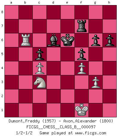 Last move : 1/2-1/2 2010 August 13 18:50:11 [Event "FICGS__CHESS__CLASS_B__000097"] [Site "FICGS"] [Date "2010.01.12"] [Round "1"] [White "Dumont,Freddy"] [Black "Axon,Alexander"] [Result "1/2-1/2"] [WhiteElo "1957"] [BlackElo "1800"] 1.e4 e5 2.Nf3 Nc6 3.Bb5 a6 4.Ba4 Nf6 5.O-O Be7 6.Re1 b5 7.Bb3 O-O 8.a4 Bb7 9.d3 d6 10.a5 Re8 11.Nbd2 Bf8 12.Nf1 d5 13.exd5 Nxd5 14.Ng5 f6 15.Nf3 Kh8 16.Ng3 Qd7 17.Bd2 Nf4 18.Ne4 Rad8 19.Rc1 Bb4 20.c3 Bf8 21.Bxf4 exf4 22.Bc2 Nxa5 23.Ra1 Bxe4 24.Rxe4 Rxe4 25.dxe4 Qxd1+ 26.Bxd1 Nc4 27.Be2 Nxb2 28.Rxa6 c5 29.Bxb5 Nd1 30.c4 Nc3 31.g4 fxg3 32.hxg3 Nxe4 33.Bc6 Nc3 34.Ra3 Rd6 35.Be8 Re6 36.Bd7 Re7 37.Bc6 Ne2+ 38.Kf1 g6 39.Bd5 Kg7 40.Nd2 Nd4 41.Ra8 Rd7 42.Ne4 f5 43.Ng5 Bd6 44.f4 h6 45.Ne6+ Kf6 46.Nf8 Rg7 47.Ra6 Ke7 48.Nh7 Ne6 49.Nf6 Nc7 50.Rb6 Nxd5 51.Nxd5+ Ke6 52.Nc3 Rf7 1/2-1/2 Ruy Lopez : Closed, 7...O-O Kingside Castling by player White (move 5) Kingside Castling by player Black (move 7) This chess game ended in a draw. Follow this game move after move (download)A Chess game is divided into three stages: the first, when you hope you have the advantage, the second when you believe you have an advantage, and the third... when you know you're going to lose ! (Savielly Tartakower) Konzentriere dich auf materielle Gewinne. Nimm, was dir dein Gegner gibt, ausser es gibt einen guten Grund der dagegenspricht. (Robert James Fischer) En posiciones complicadas, Bobby Fischer pocas veces tuvo que temer de cualquiera. (Paul Keres) Les échecs sont utiles à l'exercice de la faculté de penser et à celle de l'imagination. Car nous devons posséder une méthode élaborée pour atteindre des buts partout où nous devons conduire notre raison. (Leibnitz) The faster the computer, the slower the brain. (Thibault de Vassal)