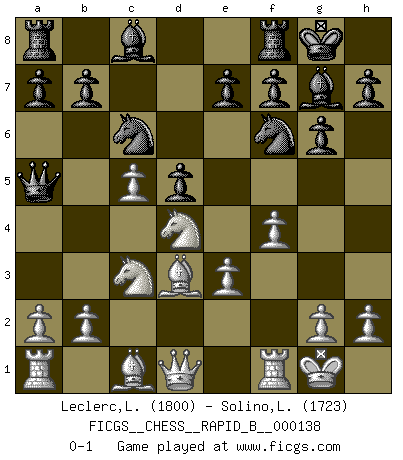 Last move : 0-1 2010 February 16 13:39:4 [Event "FICGS__CHESS__RAPID_B__000138"] [Site "FICGS"] [Date "2010.01.12"] [Round "1"] [White "Leclerc,Luc-Olivier"] [Black "Solino,Leonardo"] [Result "0-1"] [WhiteElo "1800"] [BlackElo "1723"] 1.f4 Nf6 2.Nf3 g6 3.e3 Bg7 4.d4 O-O 5.Bd3 d6 6.c4 c5 7.Nc3 d5 8.O-O cxd4 9.Nxd4 Nc6 10.c5 Qa5 0-1 Bird's Opening Kingside Castling by player Black (move 4) Kingside Castling by player White (move 8) Player Black won this chess game. Follow this game move after move (download)When you play Bobby, it is not a question if you win or lose. It is a question if you survive. (Boris Spassky) Du musst Deinen Gegner in einen tiefen dunklen Wald führen wo 2+2=5 ist und wo der Weg, der wieder hinausführt, nur breit genug für einen ist. (Mikhail Nekhemyevich Tal) Yo jugué Ajedrez con el y a veces le pude haber ganado solo que siempre devuelve su última jugada y juega la partida de manera diferente. (Mark Twain) Mais l'homme est une créature légère et illogique : semblable au joueur d'échecs, il n'aime que le processus du but à atteindre, non le but lui-même. (Dostoïevsky) No man has ever achieved immortality in his own life time. (Unknown)