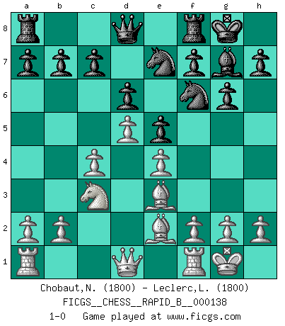 Last move : 1-0 2010 February 16 13:39:11 [Event "FICGS__CHESS__RAPID_B__000138"] [Site "FICGS"] [Date "2010.01.12"] [Round "1"] [White "Chobaut,Nicolas"] [Black "Leclerc,Luc-Olivier"] [Result "1-0"] [WhiteElo "1800"] [BlackElo "1800"] 1.d4 Nf6 2.c4 g6 3.Nc3 Bg7 4.e4 d6 5.Nf3 O-O 6.Be2 Nc6 7.O-O Bg4 8.Be3 Bxf3 9.Bxf3 e5 10.d5 Ne7 11.Be2 1-0 King's Indian : 6.Be2 Kingside Castling by player Black (move 5) Kingside Castling by player White (move 7) Player White won this chess game. Follow this game move after move (download)You are for me the Queen on d8 and I am the Pawn on d7 !! (Eduard Gufeld) Der Knackpunkt bei der Konzentration ist, daß wir nur durch sie etwas Neues und Ungewöhnliches am Schachbrett finden können. Sie ist der einzige Weg durch neue neue Ideen eine Überraschung zu bereiten. (Garry Kasparov) La estratégia requiere pensar, la táctica requiere observación. (Max Euwe) Un millionnaire : 'Monsieur Steinitz ! Vous ne participez aux tournois que pour l'argent, alors que moi je n'y viens que pour l'honneur.' Steinitz : 'Chacun joue pour ce qu'il n'a pas'... Remember : Your focus determines your reality. (Qui-Gon Jinn in Star Wars ep.1)