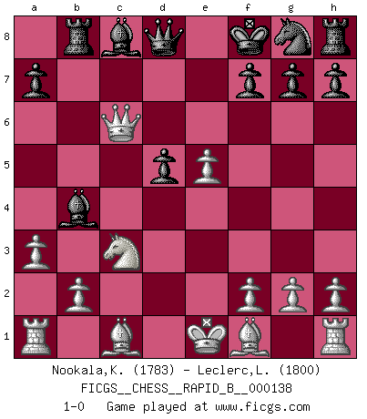 Last move : 1-0 2010 February 16 13:39:23 [Event "FICGS__CHESS__RAPID_B__000138"] [Site "FICGS"] [Date "2010.01.12"] [Round "1"] [White "Nookala,Kamesh"] [Black "Leclerc,Luc-Olivier"] [Result "1-0"] [WhiteElo "1783"] [BlackElo "1800"] 1.e4 c6 2.d4 d5 3.e5 c5 4.Nf3 Nc6 5.c4 cxd4 6.Nxd4 e6 7.Nc3 Bb4 8.Nxc6 bxc6 9.Qa4 Rb8 10.cxd5 exd5 11.Qxc6+ Kf8 12.a3 1-0 Caro-Kann : Advance variation Player White won this chess game. Follow this game move after move (download)Not all artists are Chess players, but all Chess players are artists. (Marcel Duchamp) Alles was ich jemals tun will ist Schach spielen. (Robert James Fischer) Por esta medida (el intervalo entre Fischer y sus contemporaneos), yo le considero el mas grande campeón mundial. (Garry Kasparov) La menace est plus forte que l'exécution. (Aaron Nimzovitch) Mac users swear by their computers. PC users swear at their computers. (Author unknown)