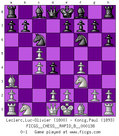 Last move : 0-1 2010 February 16 13:39:31 [Event "FICGS__CHESS__RAPID_B__000138"] [Site "FICGS"] [Date "2010.01.12"] [Round "1"] [White "Leclerc,Luc-Olivier"] [Black "Konig,Paul"] [Result "0-1"] [WhiteElo "1800"] [BlackElo "1893"] 1.f4 d5 2.Nf3 c5 3.c4 d4 4.b4 Nf6 5.bxc5 Nc6 6.Ba3 h6 0-1 Bird's Opening Player Black won this chess game. Follow this game move after move (download)What would Chess be without silly mistakes ? (Kurt Richter) Die meiste Zeit treffe ich auf Gegner, die meine Enkel sein könnten. Ich bin da, um ihnen zu zeigen, dass sie von mir noch einiges lernen können. (Viktor Kortschnoi) En posiciones complicadas, Bobby Fischer pocas veces tuvo que temer de cualquiera. (Paul Keres) A ce moment-là, je menaçais de comprendre la position ! (Clément L'Heureux) Knowledge will give you power, but character respect. (Bruce Lee)