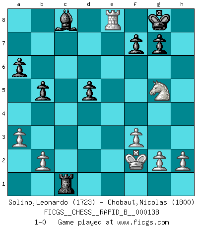 Last move : 1-0 2010 April 9 20:46:3 [Event "FICGS__CHESS__RAPID_B__000138"] [Site "FICGS"] [Date "2010.01.12"] [Round "1"] [White "Solino,Leonardo"] [Black "Chobaut,Nicolas"] [Result "1-0"] [WhiteElo "1723"] [BlackElo "1800"] 1.e4 c5 2.c3 d5 3.exd5 Qxd5 4.d4 Nf6 5.Nf3 e6 6.Be3 cxd4 7.cxd4 Nc6 8.Nc3 Qd6 9.a3 Be7 10.Bd3 O-O 11.O-O a6 12.Qe2 Rd8 13.Rad1 b5 14.Rfe1 Bb7 15.Bg5 Qc7 16.d5 Nxd5 17.Nxd5 Rxd5 18.Bxh7+ Kxh7 19.Rxd5 exd5 20.Bxe7 Nxe7 21.Ng5+ Kg8 22.Qxe7 Qxe7 23.Rxe7 Rc8 24.f3 Rc1+ 25.Kf2 Bc8 26.Re8+ 1-0 This chess game has been lost on time (started : 2010.01.12 8:2:29) Sicilian : Alapin's variation (2.c3) Kingside Castling by player Black (move 10) Kingside Castling by player White (move 11) Player White won this chess game. Follow this game move after move (download)I give 98 percent of my mental energy to Chess. Others give only 2 percent. (Bobby Fischer) Schach ist wie eine schöne Frau, zu der wir ständig zurückkehren, gleichviel, wie oft sie uns zurückweist. (Anonymous) La única cosa que los jugadores de Ajedrez tienen en común, es el Ajedrez. (Lodewijk Prins) Plusieurs personnes se sont demandées comment Tal faisait pour gagner... En fait, c'est très simple ! Il met ses pièces au centre de l'échiquier et les sacrifie quelque part ! (David Bronstein) The problem with troubleshooting is that trouble shoots back. (Anonymous)