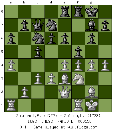 Last move : 0-1 2010 April 3 20:30:31 [Event "FICGS__CHESS__RAPID_B__000138"] [Site "FICGS"] [Date "2010.01.12"] [Round "1"] [White "Satonnet,Patrick"] [Black "Solino,Leonardo"] [Result "0-1"] [WhiteElo "1722"] [BlackElo "1723"] 1.e4 c5 2.f4 g6 3.Nf3 Bg7 4.g3 Nc6 5.Bg2 d6 6.O-O Nf6 7.d3 O-O 8.c3 Bg4 9.h3 Bxf3 10.Qxf3 Rc8 11.Be3 Nd7 12.a4 Qc7 13.Nd2 a6 14.Qe2 Rb8 15.Nf3 e6 16.h4 Rbe8 17.g4 f5 0-1 This chess game has been lost on time (started : 2010.01.12 8:2:29) Sicilian : Grand Prix attack Kingside Castling by player White (move 6) Kingside Castling by player Black (move 7) Player Black won this chess game. Follow this game move after move (download)Chess is ruthless: you've got to be prepared to kill people. (Nigel Short) Es genügt nicht ein guter Spieler zu sein, man muß auch gut spielen. (Siegbert Tarrasch) Un buen sacrificio es aquel que aunque no sea necesariamente sólido, deja a tu oponente aturdido y confuso. (Rudolph Spielmann) Echiquier : carré parfait, comme la Jérusalem nouvelle décrite par l'auteur de l'Apocalypse, huit cases sur huit, exaltation du chiffre 4, symbole du cosmos aux quatre horizons... où le noir et le blanc, l'ombre et la lumière, le mal et le bien s'entremêlent et se conjuguent. (Robert Couffignal, Le Gambit du poète) All the biggest technological inventions created by man - the airplane, the automobile, the computer - says little about his intelligence, but speaks volumes about his laziness. (Mark Kennedy)