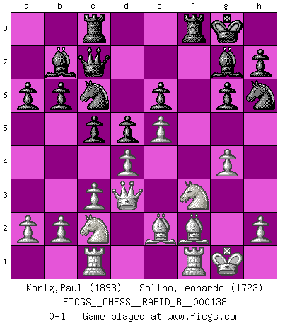 Last move : 0-1 2010 March 22 5:47:38 [Event "FICGS__CHESS__RAPID_B__000138"] [Site "FICGS"] [Date "2010.01.12"] [Round "1"] [White "Konig,Paul"] [Black "Solino,Leonardo"] [Result "0-1"] [WhiteElo "1893"] [BlackElo "1723"] 1.e4 c5 2.f4 g6 3.Nf3 Bg7 4.Bc4 Nc6 5.O-O e6 6.Be2 Nge7 7.c3 d5 8.d3 O-O 9.Na3 Rb8 10.Nc2 b6 11.e5 Bb7 12.d4 Rc8 13.Be3 Qc7 14.Bf2 a6 15.Rc1 f6 16.Qd3 Nf5 17.g4 fxe5 18.fxe5 Nh6 0-1 Sicilian : Grand Prix attack Kingside Castling by player White (move 5) Kingside Castling by player Black (move 8) Player Black won this chess game. Follow this game move after move (download)Play the opening like a book, the middle game like a magician, and the endgame like a machine. (Spielmann) Taktik ist was man tun muß, wenn etwas zu tun ist. Strategie ist was man tun muß, wenn nichts zu tun ist. (Savielly Grigorievitsch Tartakower) Tu cuerpo tiene que estar en óptima condición. Tu Ajedrez se deteriora como lo hace tu cuerpo. No puedes separar la mente y el cuerpo. (Bobby Fischer) Les ravages du H expliquent la différence de niveau entre Tal et Thal [Abergel]. Art is not a thing, it is a way. (Elbert Hubbard)