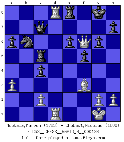 Last move : 1-0 2010 March 25 9:30:15 [Event "FICGS__CHESS__RAPID_B__000138"] [Site "FICGS"] [Date "2010.01.12"] [Round "1"] [White "Nookala,Kamesh"] [Black "Chobaut,Nicolas"] [Result "1-0"] [WhiteElo "1783"] [BlackElo "1800"] 1.e4 c5 2.Nf3 e6 3.d4 cxd4 4.Nxd4 Nc6 5.Nc3 a6 6.Be2 Qc7 7.O-O Nf6 8.Be3 Bb4 9.Na4 Be7 10.Nxc6 bxc6 11.Nb6 Rb8 12.Nxc8 Qxc8 13.Bd4 c5 14.Be5 Rb6 15.Qd3 d6 16.Bc3 O-O 17.b3 d5 18.e5 Nd7 19.Qg3 c4 20.bxc4 dxc4 21.Rfd1 Bb4 22.a3 Bxc3 23.Qxc3 Qc7 24.f4 Rc8 25.Rd4 Rc6 26.Bf3 Rc5 27.Rd6 Nb6 28.Rad1 g6 29.f5 exf5 30.e6 fxe6 31.Qf6 Re8 32.Rd8 1-0 This chess game has been lost on time (started : 2010.01.12 8:2:29) Sicilian : Taimanov variation Kingside Castling by player White (move 7) Kingside Castling by player Black (move 16) Player White won this chess game. Follow this game move after move (download)When you don't know what to play, wait for an idea to come into your opponent's mind. You may be sure that idea will be wrong. (Siegbert Tarrasch) Wenn es im Universum noch irgendwo intelligente Lebewesen gibt, dann kennen sie Go. (Emanuel Lasker) Jugadores de primera clase pierden en contra de jugadores de segunda clase porque los jugadores de segunda clase a veces juegan una partida de primer clase. (Siegbert Tarrasch) La vie et les Echecs sont tous les deux une lutte constante. (Lasker) I find television to be very educating. Every time somebody turns on the set, I go in the other room and read a book. (Groucho Marx)