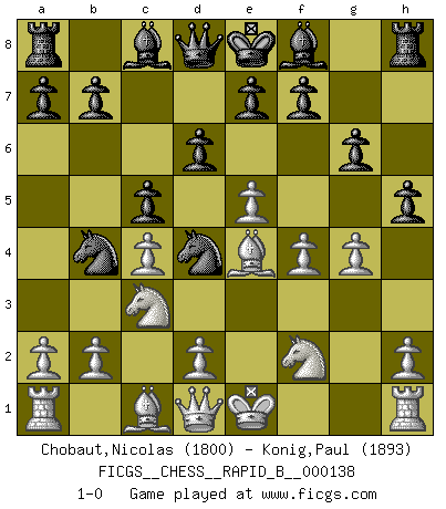 Last move : 1-0 2010 March 28 23:50:20 [Event "FICGS__CHESS__RAPID_B__000138"] [Site "FICGS"] [Date "2010.01.12"] [Round "1"] [White "Chobaut,Nicolas"] [Black "Konig,Paul"] [Result "1-0"] [WhiteElo "1800"] [BlackElo "1893"] 1.c4 Nf6 2.Nc3 g6 3.e4 c5 4.e5 Nh5 5.g4 Ng7 6.Bg2 Nc6 7.f4 d6 8.Qe2 Nb4 9.Be4 Ne6 10.Nh3 Nd4 11.Qd1 h5 12.Nf2 1-0 English Opening Player White won this chess game. Follow this game move after move (download)Alekhine is a poet who creates a work of art out of something that would hardly inspire another man to send home a picture post card. (Max Euwe) Es ist peinlich, dass ich nie Weltmeister wurde. Es wäre leicht, Leonid Breschnjew als Ursache vorzuschieben, dessen Apparat den Vorzeigekommunisten Anatoli Karpow in allem unterstützte. Aber Garri Kasparow zum Beispiel, der ebenfalls von den Sowjets unerwünscht war, hat trotz der Widerstände den WM-Titel erobert. (Viktor Kortschnoi) Fischer es el jugador mas fuerte del mundo. De hecho, el jugador mas fuerte que jamas haya existido. (Larry Evans) Dieu déplace le joueur, et celui-ci la pièce. Quel Dieu derrière Dieu commence donc la trame ? Arturo Perez-Reverte (prix de littérature policière 1993). Control your own destiny or someone else will. (Jack Welch)