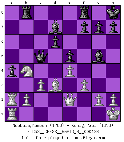 Last move : 1-0 2010 March 22 5:47:55 [Event "FICGS__CHESS__RAPID_B__000138"] [Site "FICGS"] [Date "2010.01.12"] [Round "1"] [White "Nookala,Kamesh"] [Black "Konig,Paul"] [Result "1-0"] [WhiteElo "1783"] [BlackElo "1893"] 1.e4 c5 2.Nf3 Nc6 3.d4 cxd4 4.Nxd4 Nf6 5.Nc3 e6 6.Ndb5 d6 7.Bf4 e5 8.Bg5 a6 9.Na3 b5 10.Nd5 Be7 11.Bxf6 Bxf6 12.c3 O-O 13.Nc2 Bg5 14.a4 bxa4 15.Rxa4 a5 16.Bc4 Bd7 17.Nce3 Ne7 18.Ra2 Nxd5 19.Nxd5 a4 20.O-O Rb8 21.Qe2 Qc8 22.Rfa1 Kh8 23.Bd3 Bg4 24.f3 Bd7 25.Kh1 Qc5 26.Nb4 1-0 Sicilian defense Kingside Castling by player Black (move 12) Kingside Castling by player White (move 20) Player White won this chess game. Follow this game move after move (download)In Fischer's hands, a slight theoretical advantage is as good a being a Queen ahead. (Isaac Kashdan) Es ist schade, dass viele Schachsportler vergessen, wie wichtig Auftreten und angemessene Kleidung sind. (Alexandra Kosteniuk) El Ajedrez es el arte del análisis. (Mikhail Botvinnik) Ce qui est bien, c'est d'avoir tout un tas de pièces en prise : l'adversaire ne peut en prendre qu'une à la fois. Cité par Thierry Audin. In God we trust, all others we virus scan. (Anonymous)