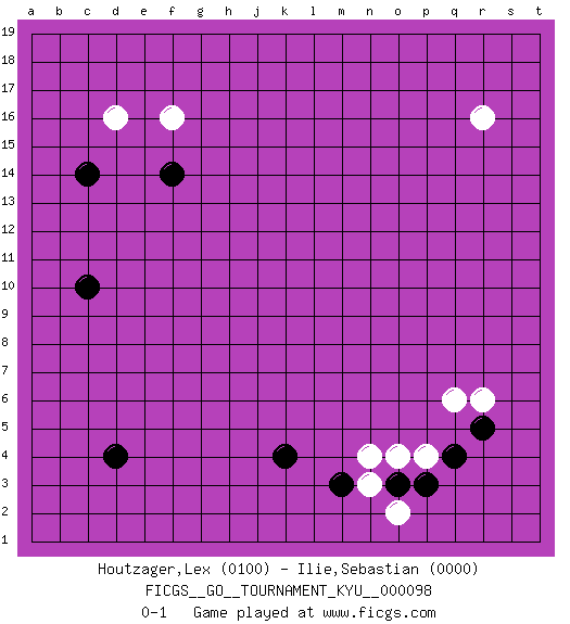Last move : 0-1 2010 March 26 21:33:12 [Event "FICGS__GO__TOURNAMENT_KYU__000098"] [Site "FICGS"] [Date "2010.01.12"] [Round "1"] [Black "Houtzager,Lex"] [White "Ilie,Sebastian"] [Result "0-1"] [Rating 1 "0100"] [Rating 2 "0000"] 1.q4 r16 2.d4 d16 3.c10 r6 4.r5 q6 5.c14 f16 6.f14 p4 7.p3 o4 8.o3 n4 9.k4 n3 10.m3 o2 0-1 This go game has been lost on time (started : 2010.01.12 23:51:37) Here are the names of the openings (joseki) played in the four corners : Corner q4 : q4 r6 Hoshi (Hwajeom, Seongjeom, Xingwei`) 4-4 Point. The star or hoshi (4-4) point, emphasizing influence at the potential expense of territory. Ikken Kakari (Hankan Keolch'im, Yi Gua`jiao~, 1-Space Low Approach). White 2 is the standard approach move to the 4-4. Corner d16 : d16 c14 Hoshi (Hwajeom, Seongjeom, Xingwei`) 4-4 Point. The star or hoshi (4-4) point, emphasizing influence at the potential expense of territory. Ikken Kakari (Hankan Keolch'im, Yi Gua`jiao~, 1-Space Low Approach). Black 2 is the standard approach move to the 4-4. Player White won this Go (weiqi, baduk) game. Follow this game move after move (download)Five groups might live but the six will die. (Anonymous) It is the aim of the modern school, not to treat every position according to one general law, but according to the principle inherent in the position. (Richard Reti)