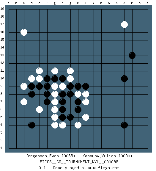 Last move : 0-1 2010 March 20 9:20:40 [Event "FICGS__GO__TOURNAMENT_KYU__000098"] [Site "FICGS"] [Date "2010.01.12"] [Round "1"] [Black "Jorgenson,Evan"] [White "Kehayov,Yulian"] [Result "0-1"] [Rating 1 "0068"] [Rating 2 "0000"] 1.q4 c16 2.d4 q17 3.q10 d10 4.d9 c9 5.e9 e10 6.f10 e11 7.r13 k4 8.j5 l5 9.k6 l7 10.k7 k8 11.j8 g5 12.h6 g7 13.h8 g9 14.g10 h9 15.j9 j10 16.h10 g8 17.k9 l8 18.l9 j11 19.f9 g11 20.f8 g6 21.h5 h4 22.h7 g4 23.f7 e6 24.d8 c7 0-1 This go game has been lost on time (started : 2010.01.12 23:51:37) Here are the names of the openings (joseki) played in the four corners : Corner q16 : q17 r13 Komoku (Somok, Xiao~mu`) 3-4 Point. The komoku (3-4) point is the traditional corner enclosure move.. Corner q4 : q4 l5 Hoshi (Hwajeom, Seongjeom, Xingwei`) 4-4 Point. The star or hoshi (4-4) point, emphasizing influence at the potential expense of territory. Player White won this Go (weiqi, baduk) game. Follow this game move after move (download)Only amateurs try to come up with fancy moves. (Anonymous) Wawaweewa ! (Borat: Cultural learnings of America for make benefit glorious nation of Kazakhstan)