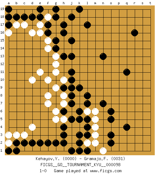 Last move : 1-0 2010 February 19 22:19:40 [Event "FICGS__GO__TOURNAMENT_KYU__000098"] [Site "FICGS"] [Date "2010.01.12"] [Round "1"] [Black "Kehayov,Yulian"] [White "Gramajo,Francisco"] [Result "1-0"] [Rating 1 "0000"] [Rating 2 "0031"] 1.r16 d4 2.q4 d16 3.k3 d10 4.l17 f8 5.q11 f10 6.j7 g9 7.j15 e11 8.j10 h10 9.j11 g11 10.j13 j9 11.k9 k8 12.j8 k7 13.h9 h8 14.j9 j6 15.k6 l6 16.k5 k4 17.l5 m5 18.l7 m6 19.l8 h7 20.l4 j4 21.l3 m4 22.o3 m3 23.n7 l2 24.k2 k1 25.j1 j2 26.l1 m2 27.o6 n1 28.o2 h5 29.j5 g6 30.n13 g12 31.g14 g13 32.h13 f14 33.g15 f15 34.f16 g16 35.h16 g17 36.h17 h18 37.f17 f18 38.g18 e16 39.j18 h19 40.g19 j19 41.k19 e17 42.e18 d19 43.d18 c19 44.c18 b19 45.b18 a18 46.a17 b17 47.a19 a16 48.a18 c17 49.e19 j3 50.h6 f7 51.k1 h1 52.h2 g1 53.g2 f1 54.f2 e1 55.e2 d1 56.d2 c1 57.c2 b1 58.b2 a2 59.a1 a3 60.b1 b3 61.h4 g5 62.h3 c3 63.o5 1-0 Here are the names of the openings (joseki) played in the four corners : Corner d16 : d16 j15 Hoshi (Hwajeom, Seongjeom, Xingwei`) 4-4 Point. The star or hoshi (4-4) point, emphasizing influence at the potential expense of territory. Corner q4 : q4 l6 Hoshi (Hwajeom, Seongjeom, Xingwei`) 4-4 Point. The star or hoshi (4-4) point, emphasizing influence at the potential expense of territory. Player Black won this Go (weiqi, baduk) game. Follow this game move after move (download)Win the stones, lose the game. (Anonymous) But they are useless. They can only give you answers. (Pablo Picasso, about computers)