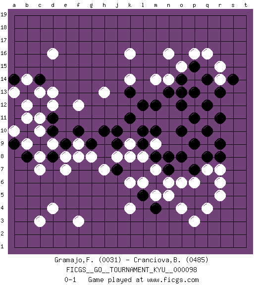 Last move : 0-1 2010 March 4 21:28:15 [Event "FICGS__GO__TOURNAMENT_KYU__000098"] [Site "FICGS"] [Date "2010.01.12"] [Round "1"] [Black "Gramajo,Francisco"] [White "Cranciova,Bogdan"] [Result "0-1"] [Rating 1 "0031"] [Rating 2 "0485"] 1.q10 d4 2.p11 d16 3.q12 q16 4.r11 q4 5.r9 k16 6.d10 k4 7.p9 r7 8.q8 q7 9.p7 p6 10.o8 o6 11.r8 r14 12.r13 p14 13.p13 n16 14.o10 d13 15.o12 n14 16.o14 o15 17.o13 c7 18.n13 m14 19.q14 r15 20.p15 p16 21.m12 k6 22.n7 n6 23.m6 m5 24.l5 l6 25.m4 m7 26.q6 r6 27.q5 r5 28.p5 o4 29.p4 p3 30.o5 n5 31.m8 l8 32.l9 m9 33.n8 k9 34.l10 k8 35.k11 f3 36.l12 k14 37.k13 c11 38.j10 f9 39.s14 f12 40.j7 j8 41.h10 h7 42.f10 h13 43.e9 g8 44.c9 e7 45.b10 c10 46.g9 f8 47.j9 c3 48.m10 b11 49.a11 b9 50.b8 a10 51.a12 b12 52.b13 a13 53.c12 d12 54.d11 c8 55.a9 d9 56.d8 e8 57.a14 c13 58.c14 b14 0-1 Here are the names of the openings (joseki) played in the four corners : Corner q4 : q4 r9 Hoshi (Hwajeom, Seongjeom, Xingwei`) 4-4 Point. The star or hoshi (4-4) point, emphasizing influence at the potential expense of territory. Player White won this Go (weiqi, baduk) game. Follow this game move after move (download)Add one stone, then sacrifice both. (Anonymous) True nature is revealed in times of difficulty. (Chinese proverb)