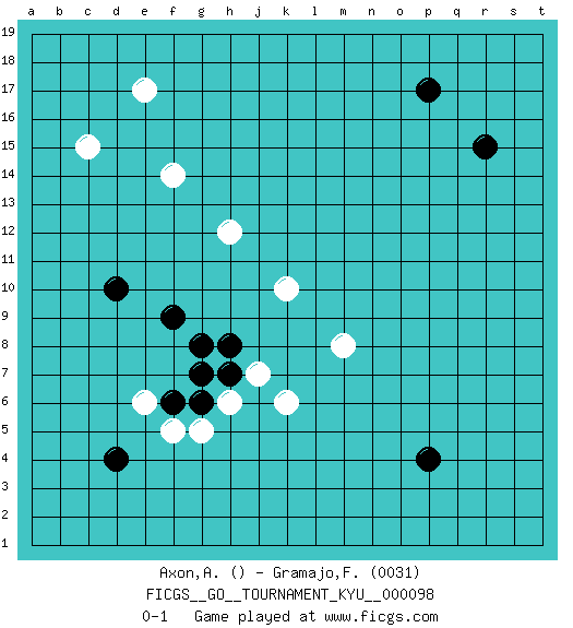 Last move : 0-1 2010 February 27 9:29:42 [Event "FICGS__GO__TOURNAMENT_KYU__000098"] [Site "FICGS"] [Date "2010.01.12"] [Round "1"] [Black "Axon,Alexander"] [White "Gramajo,Francisco"] [Result "0-1"] [Rating 2 "0031"] 1.r15 c15 2.p17 e17 3.d4 k10 4.p4 m8 5.d10 h12 6.f9 f14 7.h8 k6 8.h7 h6 9.g7 j7 10.g6 g5 11.f6 f5 12.g8 e6 0-1 This go game has been lost on time (started : 2010.01.12 23:51:37) Here are the names of the openings (joseki) played in the four corners : Corner q4 : p4 m8 Takamoku (Gomok, Gaomu`) 5-4 Point. The takamoku (high) point (5-4). With its emphasis on influence, the 5-4 point complements the 4-4 (hoshi) point in creating an influence-oriented fuseki. Player White won this Go (weiqi, baduk) game. Follow this game move after move (download)It is difficult to know exactly what you are doing. (Pierre Audouard) We cannot be sure of having something to live for unless we are willing to die for it. (Ernesto Che Guevara)