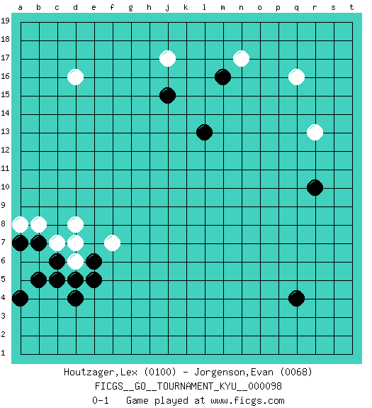 Last move : 0-1 2010 March 22 21:25:48 [Event "FICGS__GO__TOURNAMENT_KYU__000098"] [Site "FICGS"] [Date "2010.01.12"] [Round "1"] [Black "Houtzager,Lex"] [White "Jorgenson,Evan"] [Result "0-1"] [Rating 1 "0100"] [Rating 2 "0068"] 1.q4 d16 2.d4 q16 3.r10 d8 4.c6 c7 5.e6 d6 6.d5 d7 7.c5 b6 8.b5 a5 9.a4 a6 10.b7 b8 11.a7 a8 12.e5 f7 13.l13 r13 14.j15 j17 15.m16 n17 0-1 This go game has been lost on time (started : 2010.01.12 23:51:37) Here are the names of the openings (joseki) played in the four corners : Corner d4 : d4 d8 Hoshi (Hwajeom, Seongjeom, Xingwei`) 4-4 Point. The star or hoshi (4-4) point, emphasizing influence at the potential expense of territory. Corner q16 : q16 l13 Hoshi (Hwajeom, Seongjeom, Xingwei`) 4-4 Point. The star or hoshi (4-4) point, emphasizing influence at the potential expense of territory. Corner d16 : d16 j15 Hoshi (Hwajeom, Seongjeom, Xingwei`) 4-4 Point. The star or hoshi (4-4) point, emphasizing influence at the potential expense of territory. Player White won this Go (weiqi, baduk) game. Follow this game move after move (download)The possibility or impossibility of an event results logically from the rules. (Pierre Audouard) Better than a thousand days of diligent study is one day with a great teacher. (Japanese proverb)
