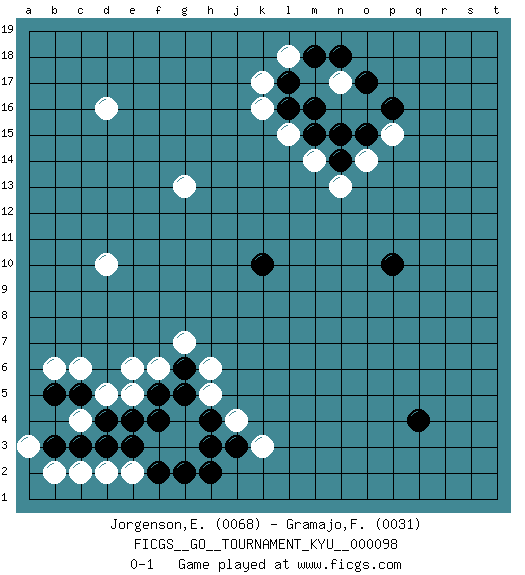 Last move : 0-1 2010 March 25 21:30:27 [Event "FICGS__GO__TOURNAMENT_KYU__000098"] [Site "FICGS"] [Date "2010.01.12"] [Round "1"] [Black "Jorgenson,Evan"] [White "Gramajo,Francisco"] [Result "0-1"] [Rating 1 "0068"] [Rating 2 "0031"] 1.q4 d16 2.p10 k16 3.d4 d10 4.p16 g13 5.l17 e5 6.e4 k17 7.l16 d5 8.f5 l15 9.m16 e6 10.m15 f6 11.g6 m14 12.n14 g7 13.k10 h6 14.g5 h5 15.h4 l18 16.m18 n17 17.n18 g4 18.f4 g3 19.h3 f3 20.e3 e2 21.c5 c6 22.b5 b6 23.h2 c4 24.d3 d2 25.c3 c2 26.b3 a3 27.f2 b2 28.g2 j4 29.j3 k3 30.n15 n13 31.o17 o14 32.o15 p15 0-1 This go game has been lost on time (started : 2010.01.12 23:51:37) Here are the names of the openings (joseki) played in the four corners : Corner d4 : d4 e5 Hoshi (Hwajeom, Seongjeom, Xingwei`) 4-4 Point. The star or hoshi (4-4) point, emphasizing influence at the potential expense of territory. Player White won this Go (weiqi, baduk) game. Follow this game move after move (download)Keep inessential ataris till the end. (Anonymous) Empty your mind, be formless, shapeless — like water. (Bruce Lee)