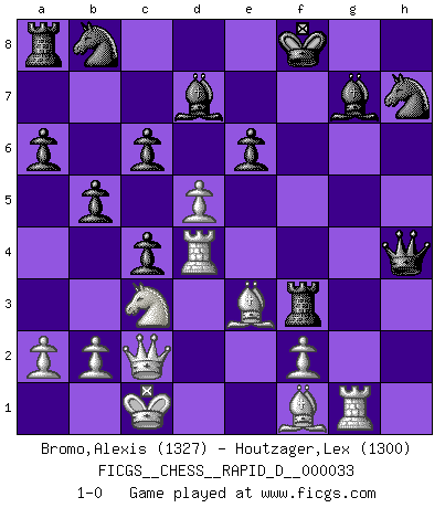Last move : 1-0 2010 March 18 9:16:50 [Event "FICGS__CHESS__RAPID_D__000033"] [Site "FICGS"] [Date "2010.01.14"] [Round "1"] [White "Bromo,Alexis"] [Black "Houtzager,Lex"] [Result "1-0"] [WhiteElo "1327"] [BlackElo "1300"] 1.d4 d5 2.c4 Nf6 3.Nc3 e6 4.Nf3 h6 5.Bd2 Be7 6.Qc2 a6 7.h3 O-O 8.g4 dxc4 9.e4 c6 10.Be3 Bd7 11.O-O-O b5 12.e5 Nh7 13.h4 f6 14.exf6 Rxf6 15.g5 Rxf3 16.gxh6 Bf6 17.hxg7 Bxg7 18.Rg1 Qxh4 19.d5 Kf8 20.Rd4 1-0 This chess game has been lost on time (started : 2010.01.14 17:3:10) QGD : Marshall defense Kingside Castling by player Black (move 7) Queenside Castling by player White (move 11) Player White won this chess game. Follow this game move after move (download)It is no time to be playing Chess when the house is on fire. (Italian Proverb) Karpov ist ein Museumsstück. (Garry Kasparov) Peones: ellos son el alma de esta partida, solos forman el ataque y la defensa. (Philidor) Les Echecs, c'est l'art de la guerre sans les charniers, c'est la résurrection des morts tombés au champ d'honneur, l'espoir perpétuel, la suprématie de l'intelligence sur la force, la culture de l'esprit. (F. Szpiner) Games, world of games... There's always an opponent, and there's always a victim. (Revolver, movie)