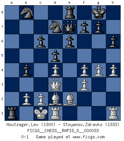 Last move : 0-1 2010 February 17 9:26:23 [Event "FICGS__CHESS__RAPID_D__000033"] [Site "FICGS"] [Date "2010.01.14"] [Round "1"] [White "Houtzager,Lex"] [Black "Stoyanov,Zdravko"] [Result "0-1"] [WhiteElo "1300"] [BlackElo "1333"] 1.d4 b6 2.Nf3 Bb7 3.g3 Bxf3 4.exf3 d5 5.Nc3 e6 6.Bb5+ c6 7.Be2 Bb4 8.Bd2 h6 9.a3 Bxc3 10.Bxc3 Nf6 11.Qd2 a5 12.O-O-O O-O 13.h4 b5 14.g4 Nfd7 15.f4 Re8 16.f3 Qe7 17.Qd3 b4 18.axb4 axb4 19.Bd2 Ra1+ 0-1 Queen's pawn : English defense Queenside Castling by player White (move 12) Kingside Castling by player Black (move 12) Player Black won this chess game. Follow this game move after move (download)When you don't know what to do, wait for your opponent to get an idea - it's sure to be wrong. (Tarrasch) Auf jeden Fall musst du zuerst Rechtsanwalt werden, damit du deine eigenen Interessen und die deiner Familie vertreten kannst. [Brief an seinen Sohn] (José Raúl Capablanca) Si no le temes a Spassky, entonces elimino el elemento del dinero. (Jim Slater) Karpov est une pièce de musée. (Garry Kasparov) Crush them ! Make them suffer ! (General Grievous in Star Wars ep.3)