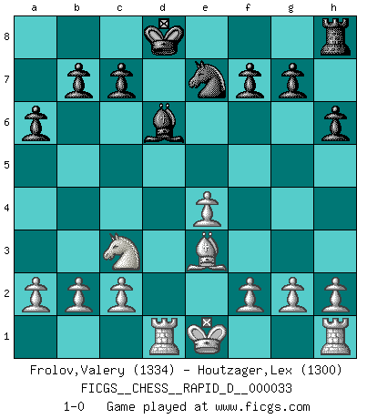 Last move : 1-0 2010 March 16 21:16:8 [Event "FICGS__CHESS__RAPID_D__000033"] [Site "FICGS"] [Date "2010.01.14"] [Round "1"] [White "Frolov,Valery"] [Black "Houtzager,Lex"] [Result "1-0"] [WhiteElo "1334"] [BlackElo "1300"] 1.e4 e5 2.Nf3 Nc6 3.Bb5 d6 4.Nc3 Bd7 5.Bxc6 Bxc6 6.d4 h6 7.dxe5 dxe5 8.Qxd8+ Rxd8 9.Nxe5 Bd6 10.Nxc6 Ne7 11.Nxd8 Kxd8 12.Be3 a6 13.Rd1 1-0 This chess game has been lost on time (started : 2010.01.14 17:3:10) Ruy Lopez : Old Steinitz defense Player White won this chess game. Follow this game move after move (download)I guess a certain amount of temperament is expected of Chess geniuses. (Ron Gross) Das Schachspiel übertrifft alle anderen Spiele so weit wie der Chimborasso einen Misthaufen. (Arthur Schopenhauer) Un sacrificio se refuta mucho mejor al aceptarlo. (Wilhelm Steinitz) Le jeu d'échecs fait naître et fortifie en nous plusieurs qualités précieuses dans le cours de l'existence, telles que la prévoyance, la circonspection, la prudence, et la persévérance. (Benjamin Franklin - 1783, la morale des échecs) A bird doesn't sing because it has an answer, it sings because it has a song. (Maya Angelou)
