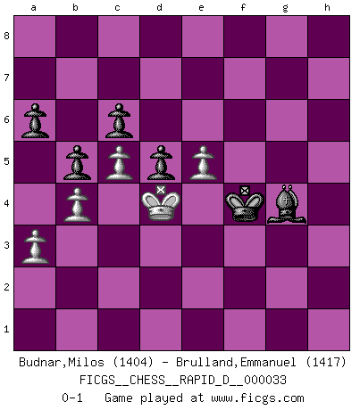 Last move : 0-1 2010 February 20 11:51:3 [Event "FICGS__CHESS__RAPID_D__000033"] [Site "FICGS"] [Date "2010.01.14"] [Round "1"] [White "Budnar,Milos"] [Black "Brulland,Emmanuel"] [Result "0-1"] [WhiteElo "1404"] [BlackElo "1417"] 1.e4 c6 2.Nc3 d5 3.Nf3 e6 4.d4 Nd7 5.Bd3 dxe4 6.Nxe4 Ngf6 7.Bg5 Be7 8.c4 Nxe4 9.Bxe7 Qxe7 10.Bxe4 Nf6 11.Bd3 O-O 12.O-O Rd8 13.Qc2 h6 14.Rad1 b6 15.Ne5 Bb7 16.c5 b5 17.Be4 Rac8 18.Rd2 Nd5 19.Bxd5 Rxd5 20.b4 Rcd8 21.Nf3 Qc7 22.Rfd1 Qf4 23.Qc3 a6 24.a3 g5 25.Qe3 Qxe3 26.fxe3 f6 27.e4 R5d7 28.e5 f5 29.h3 Kf7 30.Nh2 Kg6 31.Nf1 Kf7 32.Rd3 Kg6 33.Ne3 h5 34.g4 hxg4 35.hxg4 f4 36.Ng2 Rh7 37.Kf2 Bc8 38.Rg1 Rh2 39.Kf3 Rdh8 40.Ke4 R8h3 41.Rxh3 Rxh3 42.Ra1 Rg3 43.Ra2 Rxg4 44.Kf3 Rg3+ 45.Ke4 Bd7 46.Nxf4 gxf4 47.Kxf4 Rh3 48.Rg2+ Kf7 49.Rg3 Rxg3 50.Kxg3 Kg6 51.Kg4 Be8 52.Kf4 Kh6 53.Ke3 Kg5 54.Kf3 Kf5 55.Ke3 Bh5 56.Kd3 Kf4 57.d5 exd5 58.Kd4 Bg4 0-1 Caro-Kann : Two knights variation Kingside Castling by player Black (move 11) Kingside Castling by player White (move 12) Player Black won this chess game. Follow this game move after move (download)Adequate compensation for a sacrifice is having a sound combination leading to a winning position; adequate compensation for a blunder is having your opponent snatch defeat from the jaws of victory. (Bruce A. Moon) Ich kenne keine einzige Person, die behaupten würde, Garri Kasparow sei ein guter Mensch (Nigel Short) La captura del Rey enemigo es la finalidad pero no el primer objetivo de la partida. (William Steinitz) Le jeu d'échecs est comme rejeté hors du temps. (Antoine de Saint-Exupéry) All men can see these tactics whereby I conquer, but what none can see is the strategy out of which victory is evolved. (Sun Tzu)