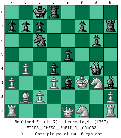 Last move : 0-1 2010 January 22 22:33:44 [Event "FICGS__CHESS__RAPID_D__000033"] [Site "FICGS"] [Date "2010.01.14"] [Round "1"] [White "Brulland,Emmanuel"] [Black "Leurette,Marc-Antoine"] [Result "0-1"] [WhiteElo "1417"] [BlackElo "1397"] 1.b3 d5 2.g3 e5 3.Bb2 Nc6 4.Bg2 Be6 5.e3 Qd7 6.Ne2 O-O-O 7.d3 Nf6 8.O-O Be7 9.Nd2 h5 10.f3 g6 11.a3 Bc5 12.b4 Bxe3+ 13.Kh1 h4 14.g4 h3 15.Ng3 hxg2+ 16.Kxg2 Rh7 17.Rh1 d4 18.Ndf1 Nxg4 19.fxg4 Bxg4 20.Qe1 Bh3+ 21.Kf3 Qg4+ 0-1 Nimzovich-Larsen attack : Classical variation Queenside Castling by player Black (move 6) Kingside Castling by player White (move 8) Player Black won this chess game. Follow this game move after move (download)Weak points or holes in the opponent's position must be occupied by pieces not Pawns. (Siegbert Tarrasch) Schach wird sich dank seiner hohen kulturellen Tradition immer durchsetzen. In näherer Zukunft womöglich sogar als Gegenreaktion auf die maßlose Reizüberflutung im Freizeit- und Spielbereich. (Garry Kasparov) Muchos se han convertido en Maestros de Ajedrez, nadie se ha convertido en el Maestro del Ajedrez. (Siegbert Tarrasch) Les erreurs sont comme les malheurs, elles n'arrivent jamais seules. (Siegbert Tarrasch) Computers have lots of memory but no imagination. (Anonymous)