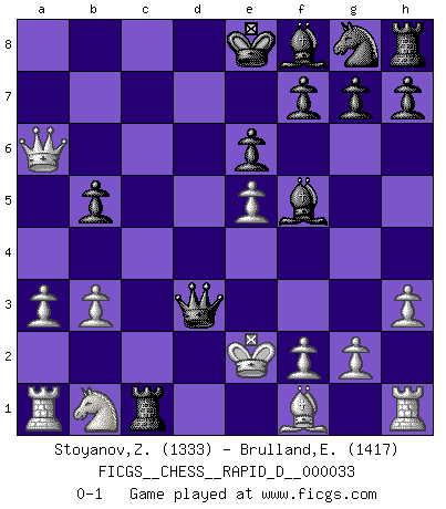 Last move : 0-1 2010 January 18 18:51:45 [Event "FICGS__CHESS__RAPID_D__000033"] [Site "FICGS"] [Date "2010.01.14"] [Round "1"] [White "Stoyanov,Zdravko"] [Black "Brulland,Emmanuel"] [Result "0-1"] [WhiteElo "1333"] [BlackElo "1417"] 1.e4 c6 2.Nf3 d5 3.e5 Bf5 4.d4 e6 5.h3 a6 6.a3 c5 7.c4 Nc6 8.b3 cxd4 9.Nxd4 Nxd4 10.Qxd4 dxc4 11.Qxc4 Rc8 12.Qa4+ b5 13.Qxa6 Rxc1+ 14.Ke2 Qd3+ 0-1 Caro-Kann defense Player Black won this chess game. Follow this game move after move (download)You know you're going to lose. Even when I was ahead I knew I was going to lose. - On playing against Fischer. (Andrew Soltis) Es tut gut, die Entwicklungsperiode von, [...] demokratischem Geist durchdringen zu lassen. Wie undemokratisch wäre es doch beispielsweise, den einen Offizier große Spaziertouren vornehmen zu lassen, während die anderen zu Hause säßen und sich entsetzlich langweilten. (Aaron Nimzowitsch) Si el Ajedrez es una ciencia, es la mas inexacta. Si el Ajedrez es un arte, es demasiado inexacto para ser visto como tal. Si el Ajedrez es un deporte, es demasiado esotérico. Si el Ajedrez es un juego, es demasiado exigente para ser solo un juego. Si el Ajedrez es una aventura, es una muy demandante. Si el Ajedrez es una pasión, es una muy gratificante. Si el Ajedrez es la vida, es una muy triste. (Anónimo) Vous m'avez demandé de vous exposer quel est le fondement de la prière. Je ne fais que préparer les pièces du jeu sur la table... Nous sera-t-il permis d'en adopter les règles et si nous les appliquons scrupuleusement nous ne tarderons pas à faire mat le Roi divin ! Il ne pourra échapper à nos mains. (Sainte Thérèse d'Avila, Chemin de perfection) He who laughs last probably does not get the joke. (Unknown)