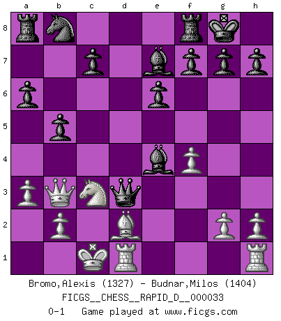 Last move : 0-1 2010 January 31 17:50:3 [Event "FICGS__CHESS__RAPID_D__000033"] [Site "FICGS"] [Date "2010.01.14"] [Round "1"] [White "Bromo,Alexis"] [Black "Budnar,Milos"] [Result "0-1"] [WhiteElo "1327"] [BlackElo "1404"] 1.d4 d5 2.c4 dxc4 3.e3 e6 4.Nc3 a6 5.Bxc4 Bb4 6.Bd2 Nf6 7.Nge2 O-O 8.Qb3 b5 9.Bd3 Bd6 10.f4 Bb7 11.e4 Be7 12.Ng3 Qxd4 13.a3 Qxd3 14.O-O-O Nxe4 15.Ngxe4 Bxe4 0-1 Queen's gambit accepted Kingside Castling by player Black (move 7) Queenside Castling by player White (move 14) Player Black won this chess game. Follow this game move after move (download)In the perfect Chess combination as in a first-rate short story, the whole plot and counter-plot should lead up to a striking finale, the interest not being allayed until the very last moment. (Yates and Winter) Ich bin Weltmeister und muß mit niemandem irgend etwas diskutieren. (Viswanathan Anand) Por la belleza de sus partidas, la claridad de su juego y lo brillante de sus ideas, Fischer se creó el mismo como un artista de la misma estatura como Brahms, Rembrandt y Shakespeare. (David Levy) Il a essayé de se convaincre qu'il pourrait empêcher toutes les erreurs et ne jamais perdre. L'horreur ! Gary Kasparov au sujet de Robert Fischer. The man who strikes first admits that his ideas have given out. (Chinese proverb)