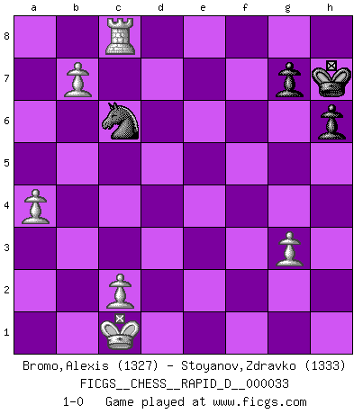 Last move : 1-0 2010 February 14 15:32:30 [Event "FICGS__CHESS__RAPID_D__000033"] [Site "FICGS"] [Date "2010.01.14"] [Round "1"] [White "Bromo,Alexis"] [Black "Stoyanov,Zdravko"] [Result "1-0"] [WhiteElo "1327"] [BlackElo "1333"] 1.e4 c5 2.Nf3 a6 3.d4 e6 4.Nc3 h6 5.Be3 b6 6.g3 d6 7.Bg2 Be7 8.e5 Bb7 9.d5 exd5 10.Nxd5 dxe5 11.Nxe5 Bf6 12.Nxf6+ Nxf6 13.Qxd8+ Kxd8 14.Bxb7 Ra7 15.Nxf7+ Ke7 16.Nxh8 Rxb7 17.Ng6+ Ke8 18.O-O-O Ng4 19.Rhe1 Nxh2 20.Bxc5 Kf7 21.Re7+ Rxe7 22.Nxe7 bxc5 23.Nf5 Kg6 24.Ne3 Kh7 25.Rd5 Nc6 26.Rxc5 Nb8 27.Rc8 Nd7 28.Ra8 Nc5 29.b4 Ne4 30.Rxa6 Nxf2 31.b5 Ne4 32.b6 Nc5 33.Ra7 Nf3 34.b7 Nd7 35.Nd5 Nfe5 36.a4 Nc6 37.Ra8 Ndb8 38.Ne7 Nxe7 39.Rxb8 Nc6 40.Rc8 1-0 Sicilian : O'Kelly variation Queenside Castling by player White (move 18) 10 pieces endgame at move 39 : White KRPPPP , Black KNPP WHITE : King + 1 Rook 4 Pawns BLACK : King + 1 Knight 2 Pawns Player White won this chess game. Follow this game move after move (download)I am the best player in the world and I am here to prove it. (Bobby Fischer) Du weisst es gibt ein Problem mit Computern und Fernschach, wenn jeder eine Rating von 2450 hat. (John Christen Knudsen) Diferente gente reacciona diferentemente en aceptar la derrota. (Bobby Fischer) Assurément je connaissais par expérience le mystérieux attrait de ce jeu royal, le seul entre tous les jeux inventés par les hommes qui échappe souverainement à la tyrannie du hasard, le seul où l'on ne doive sa victoire qu'à son intelligence ou plutôt à une certaine forme d'intelligence. Mais n'est-ce pas déjà le limiter injurieusement que d'appeler les échecs un jeu ? N'est-ce pas une science, un art ou quelque chose qui, comme le cercueil de Mahomet entre ciel et terre, est suspendu entre l'un et l'autre, et qui réunit un nombre incroyable de contraires ? [...] C'est une pensée qui ne mène à rien, une mathématique qui n'établit rien, un art qui ne laisse pas d'uvre, une architecture sans matière; et il l'a prouvé néanmoins qu'il était plus durable, à sa manière, que les livres ou que tout autre monument, ce jeu unique qui appartient à tous les peuples et à tous les temps, et dont personne ne sait quel dieu en fit don à la terre pour tuer l'ennui, pour aiguiser l'esprit et stimuler l'âme. Où commence-t-il, où finit-il ? (Stefan Zweig) The Internet isn't free. It just has an economy that makes no sense to capitalism. (Brad Shapcott)