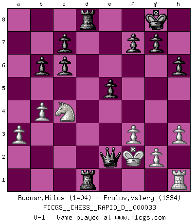 Last move : 0-1 2010 February 16 21:20:51 [Event "FICGS__CHESS__RAPID_D__000033"] [Site "FICGS"] [Date "2010.01.14"] [Round "1"] [White "Budnar,Milos"] [Black "Frolov,Valery"] [Result "0-1"] [WhiteElo "1404"] [BlackElo "1334"] 1.e4 e5 2.Nf3 Nc6 3.Bb5 Nf6 4.Bxc6 bxc6 5.Nc3 Bb4 6.d3 Qe7 7.Bd2 O-O 8.a3 Bc5 9.Bg5 h6 10.Bh4 Rb8 11.b4 Bb6 12.Na4 d5 13.Bxf6 Qxf6 14.Nxb6 axb6 15.h3 dxe4 16.dxe4 Ba6 17.c3 Rfd8 18.Qc1 Qg6 19.c4 Qxe4+ 20.Qe3 Qxc4 21.Nd2 Qc2 22.f3 Rd3 23.Qe2 Rbd8 24.Rd1 Bc4 25.Nxc4 Rxd1+ 26.Kf2 Qxe2+ 0-1 Ruy Lopez : Berlin defense Kingside Castling by player Black (move 7) Player Black won this chess game. Follow this game move after move (download)Chess is a cold bath for the mind. (Sir John Simon) Wie kann ich Remis annehmen? Ich weiß ja gar nicht, wie ich stehe! (Fritz Sämisch) Cuando veas una buena jugada, trata de encontrar otra mejor. (Emanuel Lasker) Le temps de noter son nom sur la feuille de partie, j'étais déjà en zeitnot ! D'un modeste amateur apparié lors de la première ronde d'un open contre le grand-maître Azmaïparashvili. If I had no sense of humor, I would long ago have committed suicide. (Mahatma Gandhi)