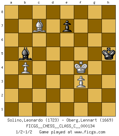 Last move : 1/2-1/2 2010 October 28 8:21:49 [Event "FICGS__CHESS__CLASS_C__000134"] [Site "FICGS"] [Date "2010.01.14"] [Round "1"] [White "Solino,Leonardo"] [Black "Oberg,Lennart"] [Result "1/2-1/2"] [WhiteElo "1723"] [BlackElo "1669"] 1.e4 d6 2.d4 Nf6 3.Nc3 g6 4.Nf3 Bg7 5.h3 O-O 6.Be3 d5 7.e5 Ne4 8.Nxe4 dxe4 9.Ng5 c5 10.c3 Nc6 11.Qd2 Qc7 12.Nxe4 cxd4 13.cxd4 Rd8 14.Qc3 Be6 15.Bb5 Bd5 16.f3 Rac8 17.O-O f5 18.Nc5 b6 19.Nd3 Qb7 20.Nb4 Nxb4 21.Qxb4 a6 22.Bd3 a5 23.Qd2 Qd7 24.b3 Bf7 25.Rac1 Rxc1 26.Rxc1 f4 27.Bf2 Bxe5 28.dxe5 Qxd3 29.Qxf4 Qe2 30.Qg5 Rd1+ 31.Rxd1 Qxd1+ 32.Kh2 Qd8 33.h4 b5 34.e6 Bxe6 35.Qxb5 Kf7 36.Qg5 Bf5 37.Qh6 Kg8 38.Qc1 Qd6+ 39.Bg3 Qd4 40.Qc7 Qb4 41.h5 gxh5 42.Qd8+ Kg7 43.Qe8 Qc5 44.Qxh5 Kf8 45.Bf4 Kg7 46.a3 Kf6 47.Qg5+ Kf7 48.b4 axb4 49.axb4 Qb5 50.Bc7 Bd3 51.Qxb5 Bxb5 52.g4 Kg6 53.Kg3 h5 54.gxh5+ Kxh5 55.Kf4 1/2-1/2 Pirc : Classical, h3 system Kingside Castling by player Black (move 5) Kingside Castling by player White (move 17) 10 pieces endgame at move 51 : White KQBPPP , Black KBPP WHITE : King + 1 Queen 1 Bishop 3 Pawns BLACK : King + 1 Bishop 2 Pawns 9 pieces endgame at move 51 : White KBPPP , Black KBPP WHITE : King + 1 Bishop 3 Pawns BLACK : King + 1 Bishop 2 Pawns 8 pieces endgame at move 54 : White KBPPP , Black KBP WHITE : King + 1 Bishop 3 Pawns BLACK : King + 1 Bishop 1 Pawn 7 pieces endgame at move 54 : White KBPP , Black KBP WHITE : King + 1 Bishop 2 Pawns BLACK : King + 1 Bishop 1 Pawn This chess game ended in a draw. Follow this game move after move (download)Dazzling combinations are for the many, shifting wood is for the few. (Georg Kieninger) Auf Remis zu spielen ist gewissermaßen ein Verbrechen gegen das Schachspiel. (Mikhail Nekhemyevich Tal) a manera como él juega al Ajedrez, demuestra la completa naturaleza de un hombre. (Stanley Ellin) Si le désir cupide (et stupide) de gagner est une inépuisable source de souffrance, une combinaison brillante sur l'échiquier est une découverte : le coquelicot qui s'épanouit lorsque apparaît la Voie Lactée. (Arrabal) The project of the man are lower than those of the sky. (Chinese proverb)