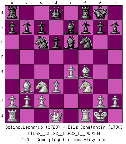 Last move : 1-0 2010 February 28 9:31:19 [Event "FICGS__CHESS__CLASS_C__000134"] [Site "FICGS"] [Date "2010.01.14"] [Round "1"] [White "Solino,Leonardo"] [Black "Bilz,Constantin"] [Result "1-0"] [WhiteElo "1723"] [BlackElo "1700"] 1.e4 e5 2.Nc3 Nc6 3.Bc4 d6 4.d3 Nf6 5.f4 exf4 6.Bxf4 Be7 7.Nf3 O-O 8.O-O Be6 9.Bb3 1-0 This chess game has been lost on time (started : 2010.01.14 20:8:12) Vienna game, Max Lange defense Kingside Castling by player Black (move 7) Kingside Castling by player White (move 8) Player White won this chess game. Follow this game move after move (download)I'd rather have a Pawn than a finger. (Reuben Fine) Ich erzeugte keinen Neid, da mich die Schachspieler als Musiker und die Musiker als Schachspieler betrachteten. (Mark Taimanov) Cualquier cambio de material en una posición debe venir por medio de un mate, una captura o promoción de Peón. (Purdy) Tous ces prétendus hommes politiques sont les pions, les Cavaliers, les Tours ou les Fous d'une partie d'échecs qui se jouera tant qu'un hasard ne renversera pas l'échiquier. (Honoré de Balzac) A belief is an idea the mind possesses, an idea that possesses the mind. (Robert Oxden Bolton)