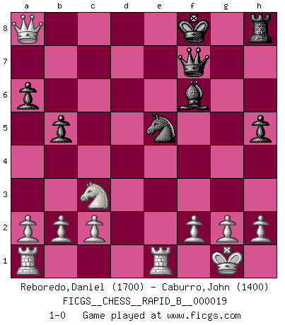 Last move : 1-0 2006 November 2 0:56:39 [Event "FICGS__CHESS__RAPID_B__000019"] [Site "FICGS"] [Date "2006.10.14"] [Round "1"] [White "Reboredo,Daniel"] [Black "Caburro,John"] [Result "1-0"] [WhiteElo "1700"] [BlackElo "1400"] 1.e4 c5 2.Nf3 d6 3.d4 cxd4 4.Nxd4 Nf6 5.Nc3 a6 6.Bc4 e6 7.Bb3 b5 8.O-O Bb7 9.Re1 Be7 10.Bxe6 fxe6 11.Nxe6 Qd7 12.Nxg7+ Kf7 13.Nf5 h5 14.Bg5 Nc6 15.Bxf6 Bxf6 16.Nxd6+ Kf8 17.Nxb7 Qxb7 18.Qf3 Qf7 19.e5 Nxe5 20.Qxa8+ 1-0 Sicilian : Najdorf, Lipnitzky attack Kingside Castling by player White (move 8) Player White won this chess game. Follow this game move after move (download)A chess genius has died; a loss for humanity. (Viktor Kortchnoi, about Bobby Fischer's death) Er war ein guter Schachspieler, aber ich kann Leute nicht ausstehen, die 'Heil Hitler' rufen (Über Alexander Aljechin). (Miguel Najdorf) Preferería tener un Peón que un dedo. (Reuben Fine) Karpov est une pièce de musée. (Garry Kasparov) Life is pleasant. Death is peaceful. It's the transition that's troublesome. (Isaac Asimov)