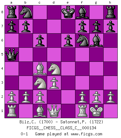 Last move : 0-1 2010 March 23 9:25:5 [Event "FICGS__CHESS__CLASS_C__000134"] [Site "FICGS"] [Date "2010.01.14"] [Round "1"] [White "Bilz,Constantin"] [Black "Satonnet,Patrick"] [Result "0-1"] [WhiteElo "1700"] [BlackElo "1722"] 1.e4 d5 2.exd5 Qxd5 3.Nc3 Qa5 4.Nf3 Nf6 5.Bc4 c6 6.O-O Bf5 7.Nd4 e6 8.d3 Bg6 0-1 This chess game has been lost on time (started : 2010.01.14 20:8:12) Scandinavian (centre counter) defense Kingside Castling by player White (move 6) Player Black won this chess game. Follow this game move after move (download)In a gambit you give up a Pawn for the sake of getting a lost game. (Samuel Standige Boden) Es ist wirklich schade, dass so viele Schachspieler nicht auf ihr Äußeres achten! (Alexandra Kosteniuk) El pensamiento metódico es mas útil en el Ajedrez que la inspiración. (C. J. S. Purdy) Aux échecs, les retours au sommet sont rares : les dommages psychologiques consécutifs à une défaite sont trop sévères. (Daily Telegraph) Memory is a way of holding onto the things you love, the things you are, the things you never want to lose. (from the television show: The Wonder Years)