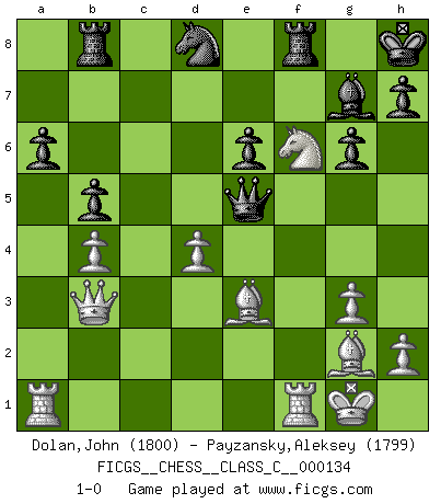 Last move : 1-0 2010 January 26 18:3:40 [Event "FICGS__CHESS__CLASS_C__000134"] [Site "FICGS"] [Date "2010.01.14"] [Round "1"] [White "Dolan,John"] [Black "Payzansky,Aleksey"] [Result "1-0"] [WhiteElo "1800"] [BlackElo "1799"] 1.e4 c5 2.c4 Nc6 3.Nc3 g6 4.g3 Bg7 5.Bg2 Nf6 6.Nge2 d6 7.O-O O-O 8.d3 Be6 9.a3 Qc8 10.Nf4 Rb8 11.Nxe6 fxe6 12.Bh3 Nd8 13.Be3 Qc6 14.Qc2 a6 15.b4 cxb4 16.axb4 d5 17.e5 Nd7 18.cxd5 exd5 19.f4 e6 20.Qb3 b5 21.Bg2 Kh8 22.Nxd5 Nxe5 23.Nf6 Qd6 24.fxe5 Qxe5 25.d4 1-0 Sicilian defense Kingside Castling by player White (move 7) Kingside Castling by player Black (move 7) Player White won this chess game. Follow this game move after move (download)There is no remorse like the remorse of Chess. (H. G. Wells) Ich hatte Angst gegen einen russischen Großmeister zu verlieren, und er befürchtete gegen einen kleinen Jungen zu verlieren. (über ein Remis gegen Juri Awerbach). (Robert James Fischer) Solo existe una cosa que Fischer hace en el Ajedrez sin placer: ¡perder!. (Boris Spassky) Le pion, dans sa simplicité, marche droit devant lui, mais lorsqu'il prend, il le fait obliquement? Ainsi l'homme, tant qu'il reste pauvre, marche dans la droiture et vit honnêtement, mais lorsqu'il recherche les honneurs, il flatte, se parjure et, par les voies obliques, cherche une position supérieure sur l'échiquier du monde. (Jean de Galles) The Internet is the first thing that humanity has build that humanity doesn't understand, the largest experiment in anarchy that we have ever had. (Eric Schmidt)