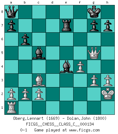 Last move : 0-1 2010 March 24 19:53:57 [Event "FICGS__CHESS__CLASS_C__000134"] [Site "FICGS"] [Date "2010.01.14"] [Round "1"] [White "Oberg,Lennart"] [Black "Dolan,John"] [Result "0-1"] [WhiteElo "1669"] [BlackElo "1800"] 1.Nf3 d6 2.e4 Nf6 3.Nc3 Nbd7 4.d4 e5 5.Bc4 Be7 6.Ng5 O-O 7.Bxf7+ Rxf7 8.Ne6 Qe8 9.Nxc7 Qd8 10.Nxa8 b6 11.dxe5 Nxe5 12.O-O Ba6 13.Re1 Nfg4 14.f4 d5 15.g3 Qxa8 16.exd5 Bc5+ 17.Kg2 Nf2 18.Qh5 Neg4 19.h3 Nf6 20.Qg5 Bc4 21.Bd2 N2e4 22.Nxe4 Nxe4 23.Rxe4 Bxd5 24.Bc3 Bxe4+ 25.Kh2 Re7 0-1 Reti Opening Kingside Castling by player Black (move 6) Kingside Castling by player White (move 12) Player Black won this chess game. Follow this game move after move (download)I have always a slight feeling of pity for the man who has no knowledge of Chess. (Siegbert Tarrasch) Ich bin stolz ein Bulgare zu sein. (Veselin Topalov) Entre mas años cumplo, mas valoro los Peones. (Keres) Un footballeur joue avec ses pieds, parfois avec sa tête. Un joueur d'échecs ne joue qu'avec sa tête. Et quand il ne joue plus, il meurt. (Jacob Murray) Perhaps the current trend of many chess professionals taking up the more lucrative pastime of poker is not a wholly negative one. It may not be too late for humans to relearn how to take risks in order to innovate and thereby maintain the advanced lifestyles we enjoy. And if it takes a poker-playing supercomputer to remind us that we can't enjoy the rewards without taking the risks, so be it. (The Chess Master and the Computer, by Garry Kasparov - 2010)