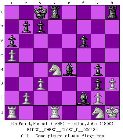 Last move : 0-1 2010 February 5 19:45:35 [Event "FICGS__CHESS__CLASS_C__000134"] [Site "FICGS"] [Date "2010.01.14"] [Round "1"] [White "Gerfault,Pascal"] [Black "Dolan,John"] [Result "0-1"] [WhiteElo "1685"] [BlackElo "1800"] 1.e4 e5 2.Nf3 Nc6 3.d4 exd4 4.Nxd4 Bb4+ 5.c3 Bc5 6.Nb3 Bb6 7.a4 a6 8.Be2 Nf6 9.Qc2 d5 10.exd5 Qxd5 11.O-O Bf5 12.Qd1 O-O-O 13.Qxd5 Nxd5 14.a5 Ba7 15.Bg5 f6 16.Bh4 h5 17.h3 Nf4 18.Bf3 Ne5 19.N1d2 Bd3 20.Rfe1 Nxf3+ 21.Nxf3 g5 22.Bg3 Ne2+ 23.Kh1 h4 24.Bh2 Bxf2 25.Red1 Ng3+ 26.Bxg3 hxg3 27.Ng1 g4 28.Nd4 Be4 0-1 Scotch game Kingside Castling by player White (move 11) Queenside Castling by player Black (move 12) Player Black won this chess game. Follow this game move after move (download)Chess is war over the board. The object is to crush the opponents mind. (Bobby Fischer) Mein Name ist Rustam Kamsky. Sie haben meinen Sohn belästigt. Bereiten Sie sich aufs Sterben vor. (Rustam Kamsky) La batalla por la última verdad nunca sera ganada. Y es por eso que el Ajedrez es tan fascinante. (Hans Kmoch) En blitz, le Cavalier l'emporte sur le Fou. (Vlastimil Hort) History is the quarrels of popes and kings, with wars or pestilences in every page; the men all so good for nothing, and hardly any women at all. (Jane Austen)