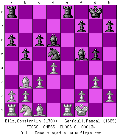 Last move : 0-1 2010 April 1 8:25:33 [Event "FICGS__CHESS__CLASS_C__000134"] [Site "FICGS"] [Date "2010.01.14"] [Round "1"] [White "Bilz,Constantin"] [Black "Gerfault,Pascal"] [Result "0-1"] [WhiteElo "1700"] [BlackElo "1685"] 1.e4 e5 2.Nf3 Nc6 3.Bb5 a6 4.Ba4 Nf6 5.O-O Be7 6.Re1 b5 7.Bb3 O-O 8.c3 d5 9.exd5 Nxd5 10.Nxe5 Nxe5 11.Rxe5 c6 12.d4 Bd6 13.Re1 Qh4 14.g3 Qh3 15.Re4 g5 16.Qf1 Qxf1+ 17.Kxf1 Bf5 18.Re1 Rfe8 0-1 Ruy Lopez : Closed, 7...O-O Kingside Castling by player White (move 5) Kingside Castling by player Black (move 7) Player Black won this chess game. Follow this game move after move (download)No one ever won a game by resigning. (Unknown) Frage: Wie viele Autos haben Sie schon zerstört? - Antwort: Nur zwei. (Loek van Wely) Repentinamente, me resultaba obvio en mi analisis que yo había pasado por alto lo que Fischer había visto en el tablero con la mas grande facilidad. (Mikhail Botvinnik) Soyez une menace à chaque fois que vous vous asseyez pour jouer. (Ken Smith) Your best chance to get a Royal Flush in a casino is in the bathroom. (Anonymous)